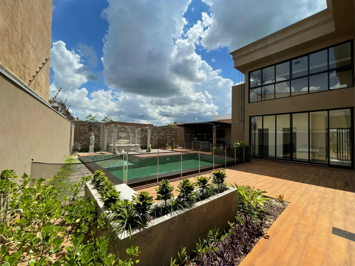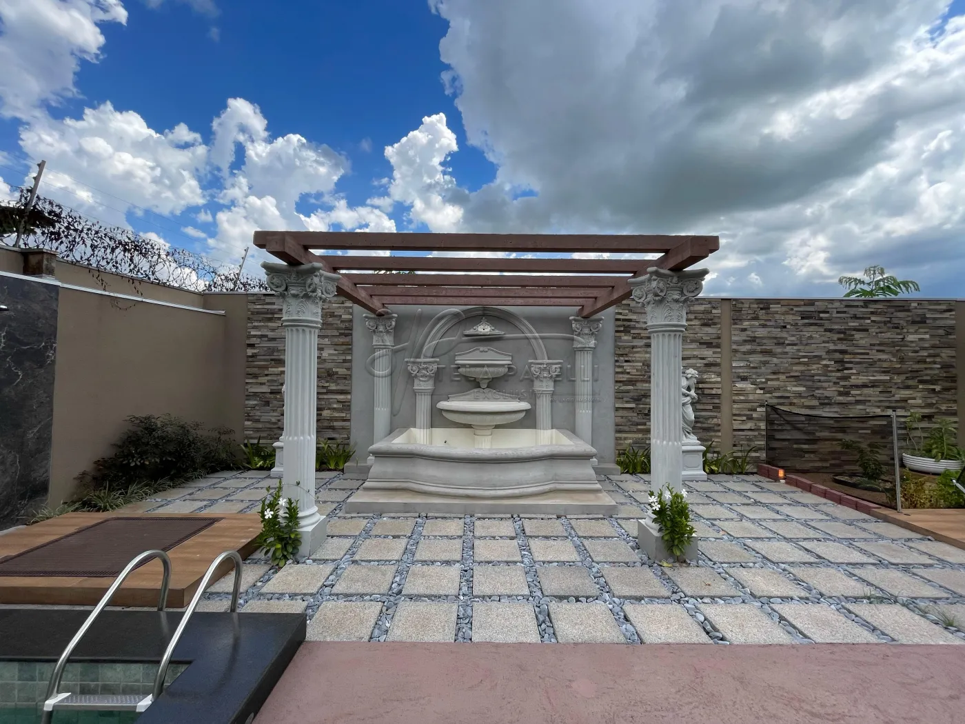 -Jardim externo com fonte e paisagismo;