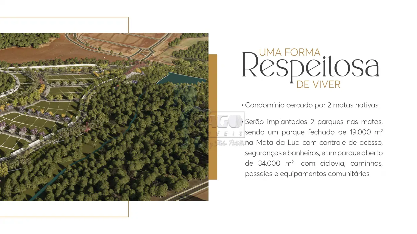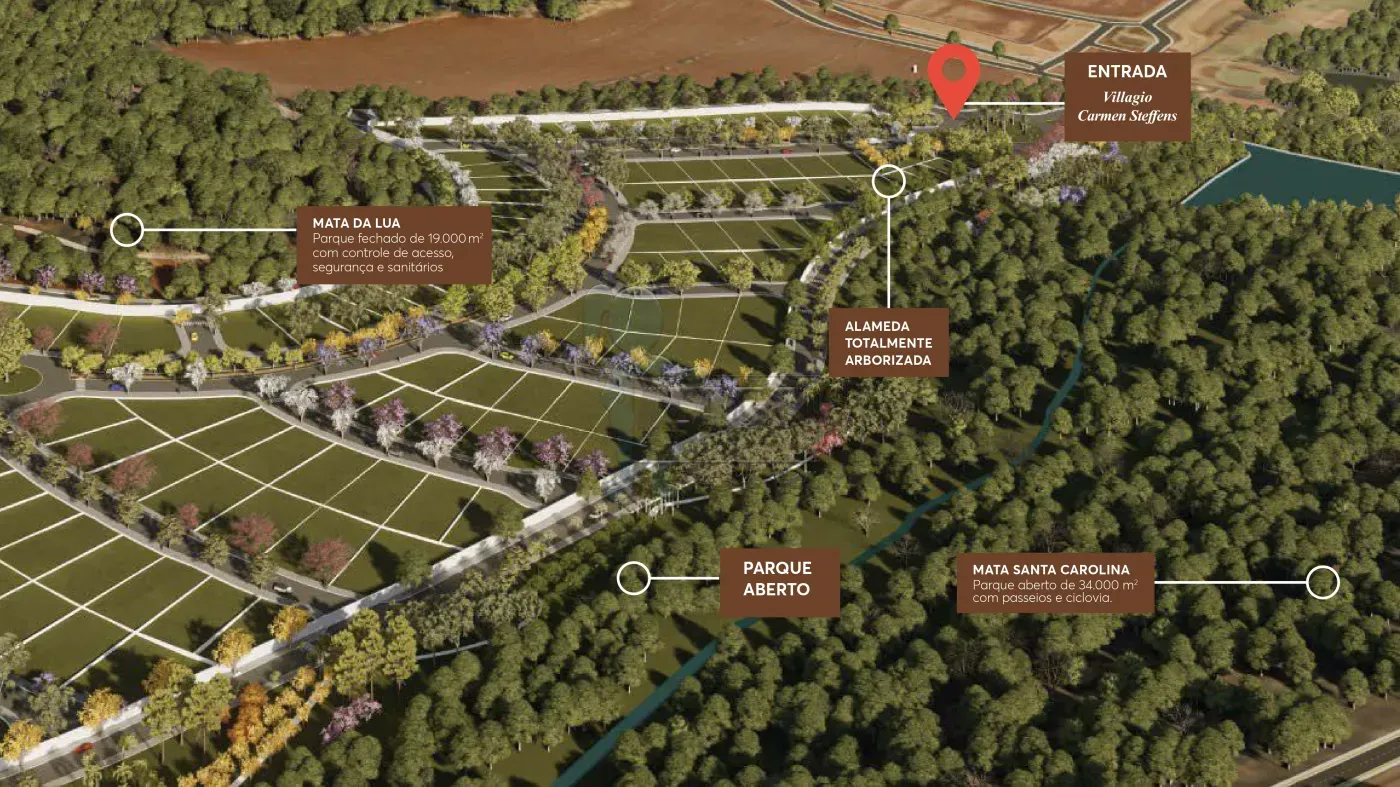 -Condomínio cercado por duas áreas nativas, com implantação de 02 parques nas matas Santa Carolina e Mata da Lua, sendo 01 parque fechado de 19.000m² com controle de acesso, segurança e banheiros e outro parque aberto de 34.000m² com ciclovia, caminhos, passeios e equipamentos comunitários.